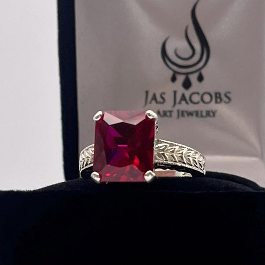 6ctw Emerald Cut Lab Ruby Ring Size 7 Carved Band