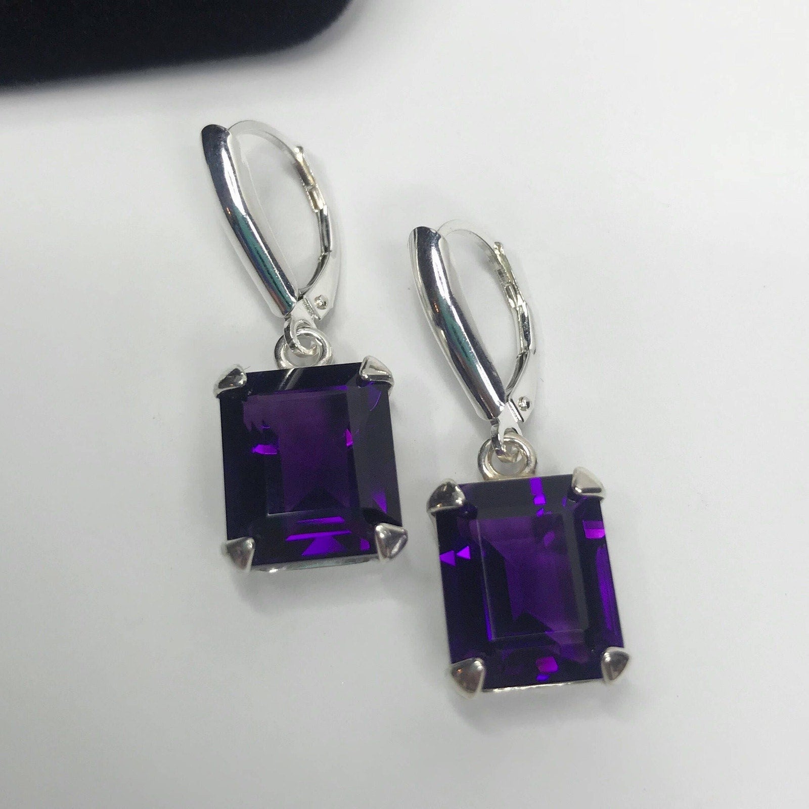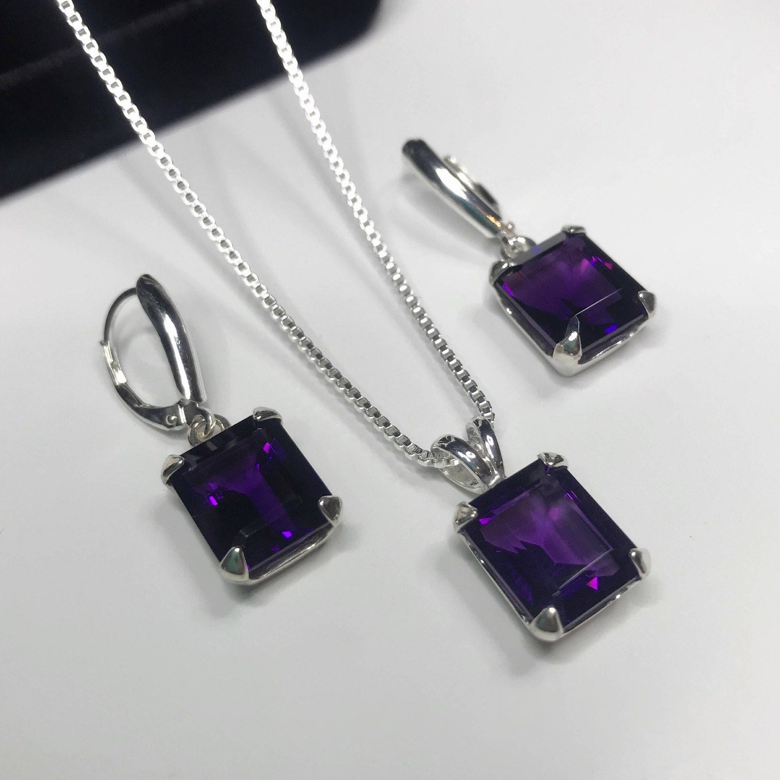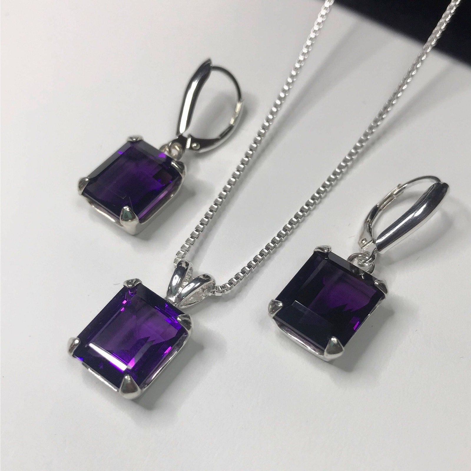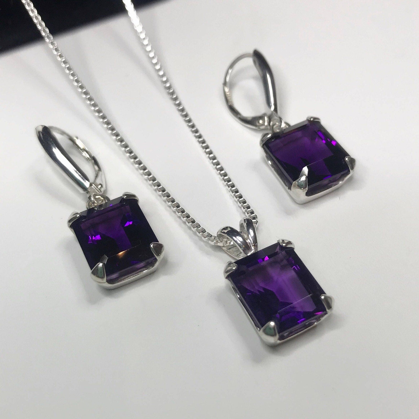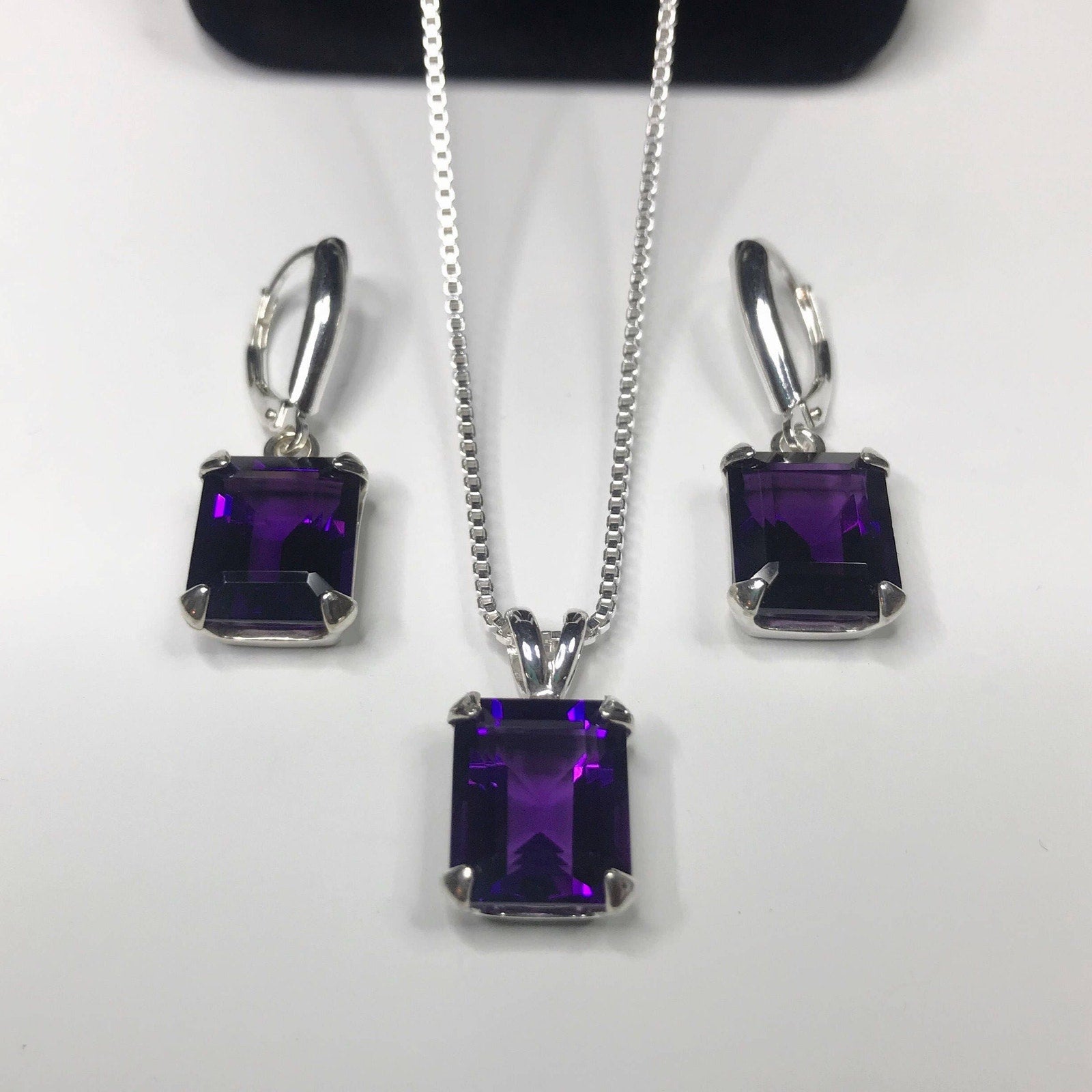 BEAUTIFUL 16.5ctw Emerald Cut Amethyst Earrings & Pendant Necklace Set Sterling Silver Trending Jewelry Gift February Birthstone