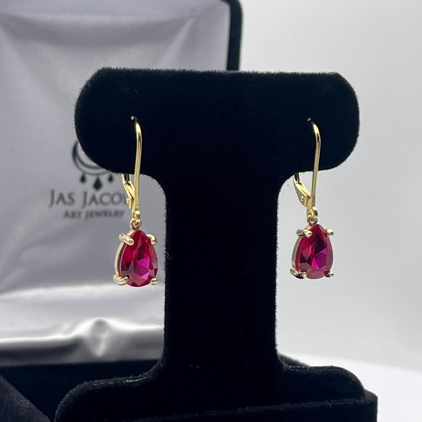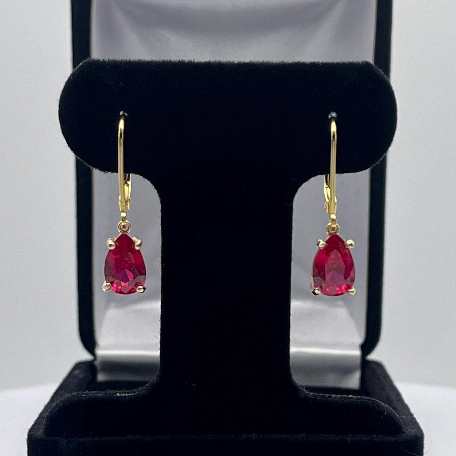 Beautiful 3ctw Pear Cut Ruby Earrings 14k Gold Drop Dangle Ruby