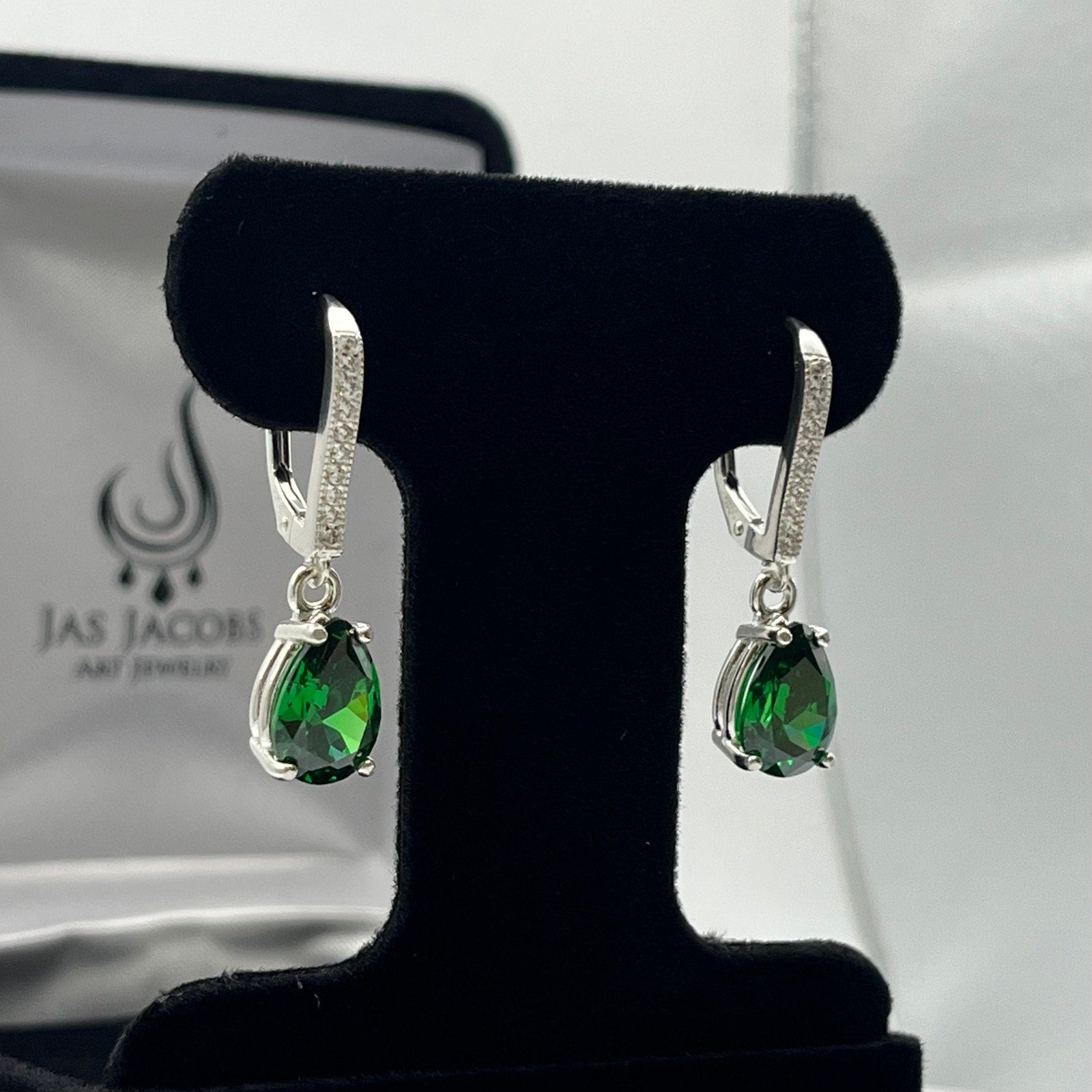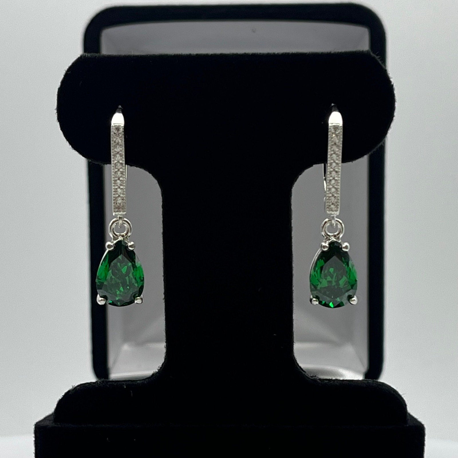 Beautiful 5ctw Pear Cut Emerald Earrings with White Sapphire Accents set in Sterling Silver