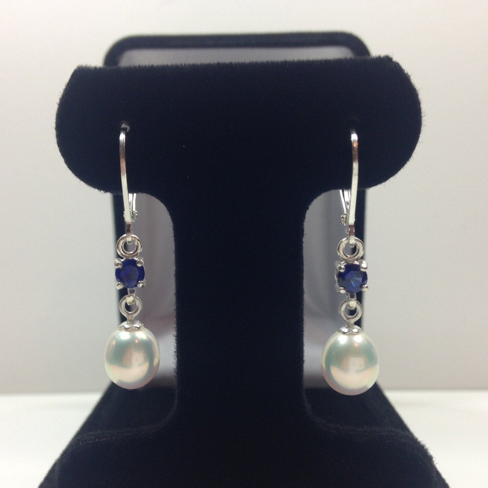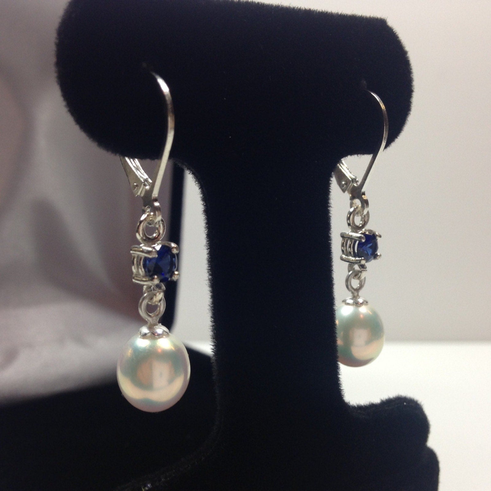 Beautiful Pearl & Sapphire Earrings in Sterling Silver Drop Dangle Pearl Earrings